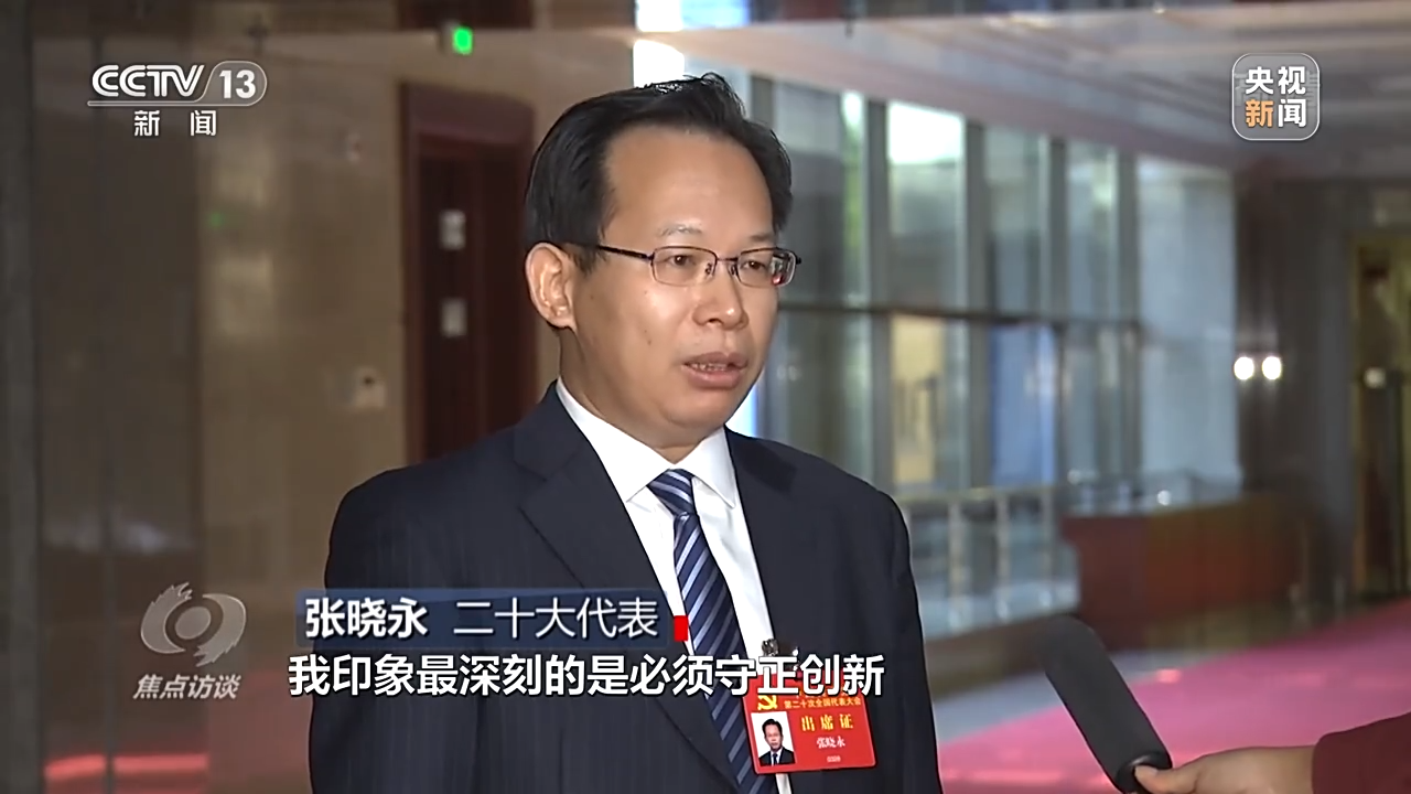 二十大代表 张晓永:对于蕴含其中的立场、观点和方法,我印象最深刻的是必须守正创新。守正,就不能偏了航向;创新,必然要求与时俱进。我们有这样的决心,也有这样的信心。
