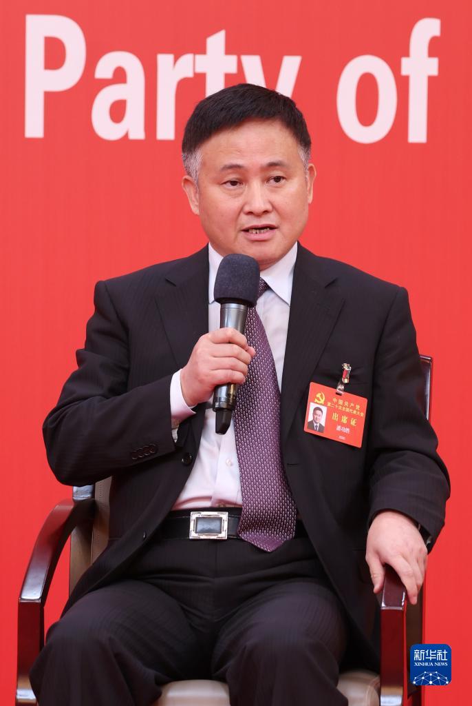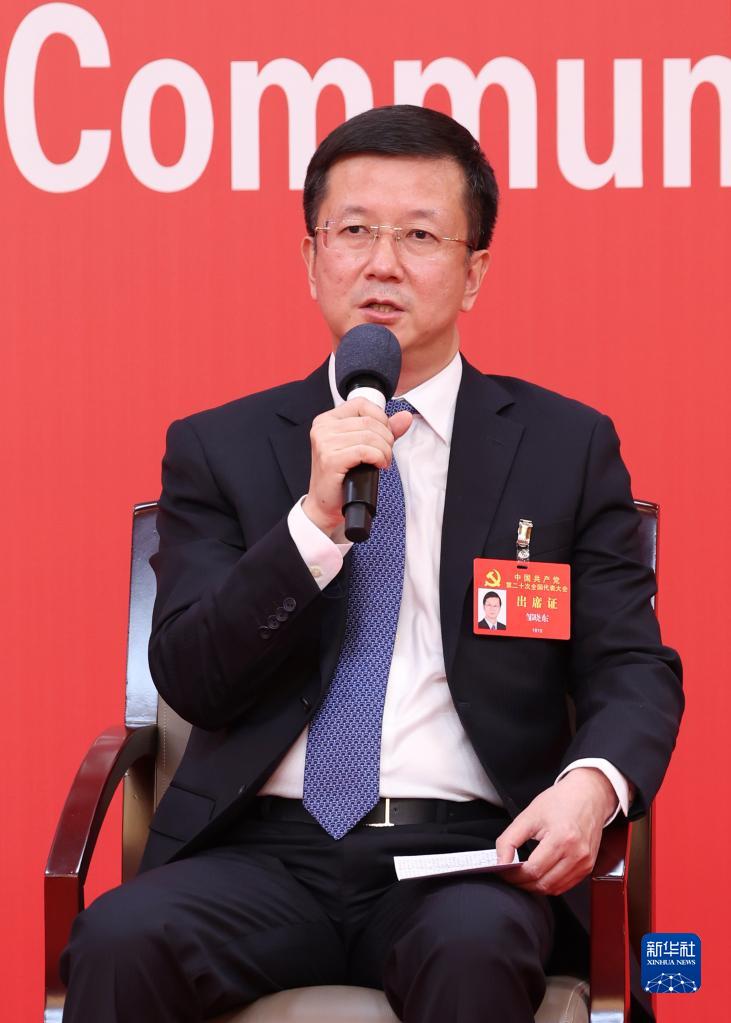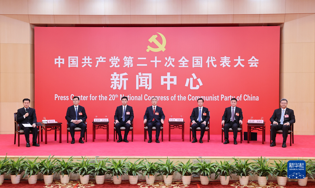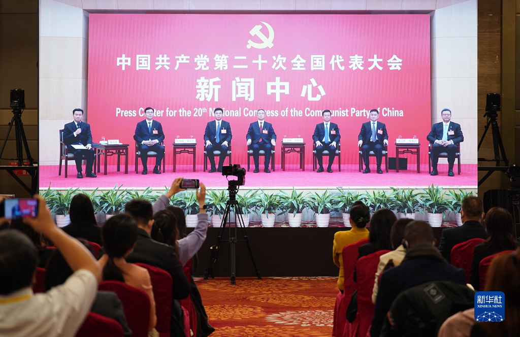 10月20日,中国共产党第二十次全国代表大会新闻中心举行集体采访。青海、宁夏、新疆、中央和国家机关、中央金融系统、中央企业系统(在京)代表团新闻发言人出席,介绍代表团学习讨论二十大报告情况,并回答记者提问。新华社记者 陈建力 摄