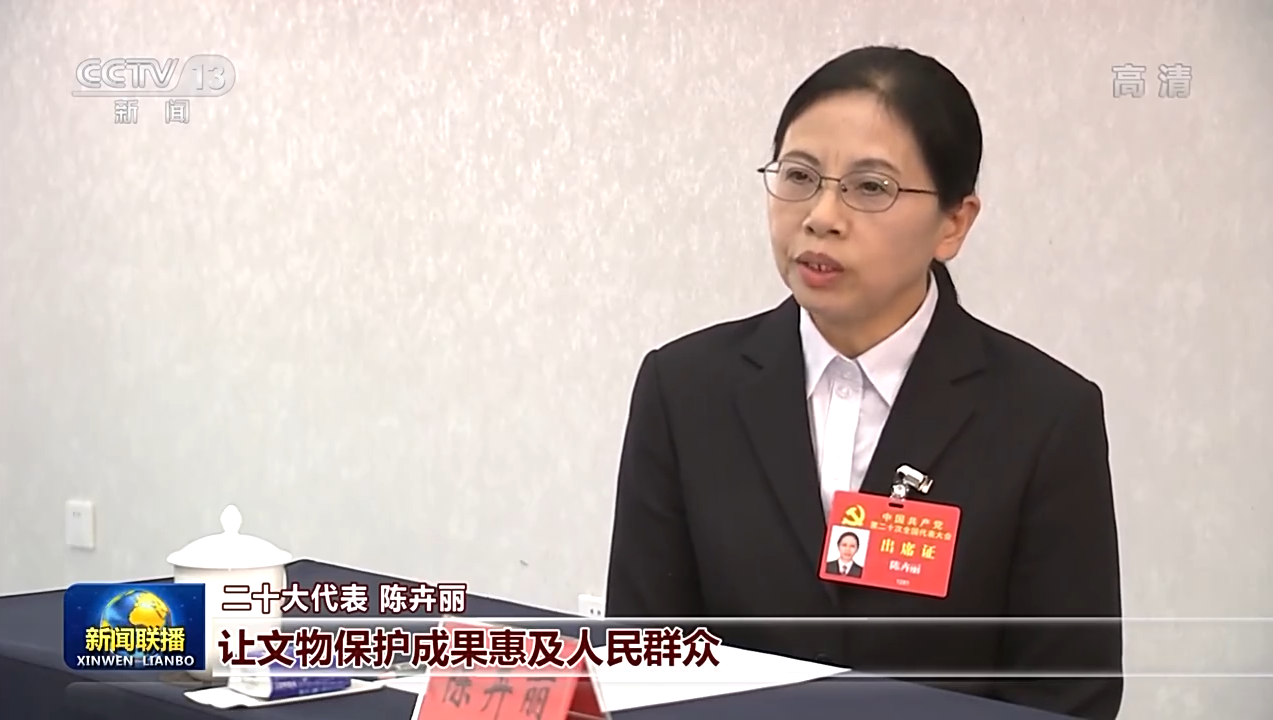 二十大代表 陈卉丽:党的二十大报告提出推进文化自信自强,铸就社会主义文化新辉煌,新时代我们文物工作者的使命,就是要按照习近平总书记关于文物工作的系列指示批示精神为引领,提升文物保护科技水平,还要更进一步地揭示文物蕴含其中的中华民族的文化精神和文化胸怀,让文物保护成果惠及人民群众。