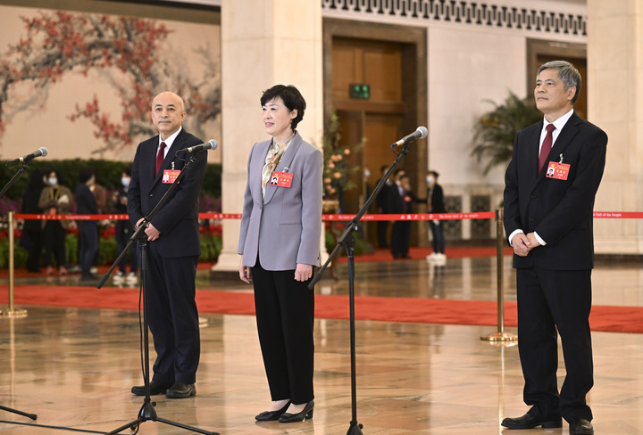 朱有勇、王亚平、武大靖代表(自左至右)在“党代表通道”接受采访。新华社记者 金良快 摄