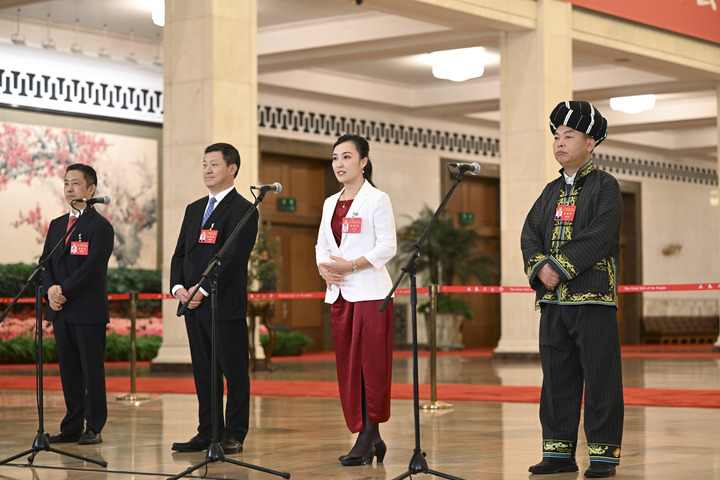 杨彦锋、宋学文、祁洪芳、李绍杰代表(自左至右)在“党代表通道”接受采访。新华社记者 金良快 摄