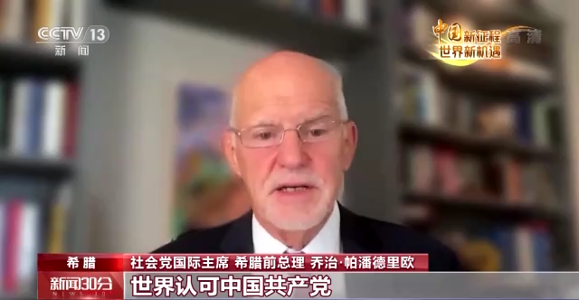 希腊社会党国际主席 希腊前总理 乔治·帕潘德里欧:世界认可中国共产党为联合国千年发展目标所作的贡献,中国成功消除绝对贫困,提高了中国人民生活质量。