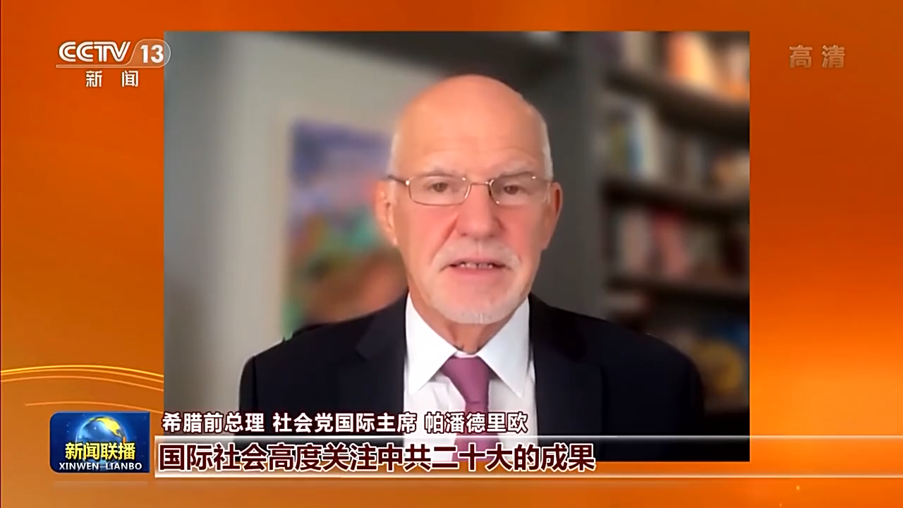 希腊前总理 社会党国际主席 帕潘德里欧:国际社会高度关注中共二十大的成果,中国成功消除绝对贫困,提高了中国人民生活质量。国际社会积极评价中国共产党为联合国千年发展目标所作的贡献,我们还看到中国共产党制定了长期规划和目标,以中国式现代化促进人与自然和谐共生。