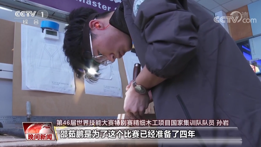 第46届世界技能大赛特别赛精细木工项目国家集训队队员 孙岩:邵茹鹏为了这个比赛已经准备了四年,每天早上八点钟一直训练到晚上九点钟,一直不间断,除了中午吃个饭、晚上吃个饭,其他时间几乎都在训练。