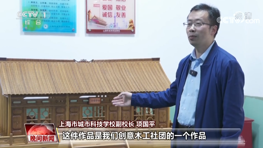 上海市城市科技学校副校长 项国平:这么多年以来,国家重视技能人才,学校里面成立了很多学生社团。这件作品是我们创意木工社团的一个作品,我们的指导老师带着社团的学生去完成的,是一个仿松江的明清古建筑。就业的话应该说非常好,像我们建筑类的专业,包括其他几个专业,就业都非常好,可以说是供不应求。