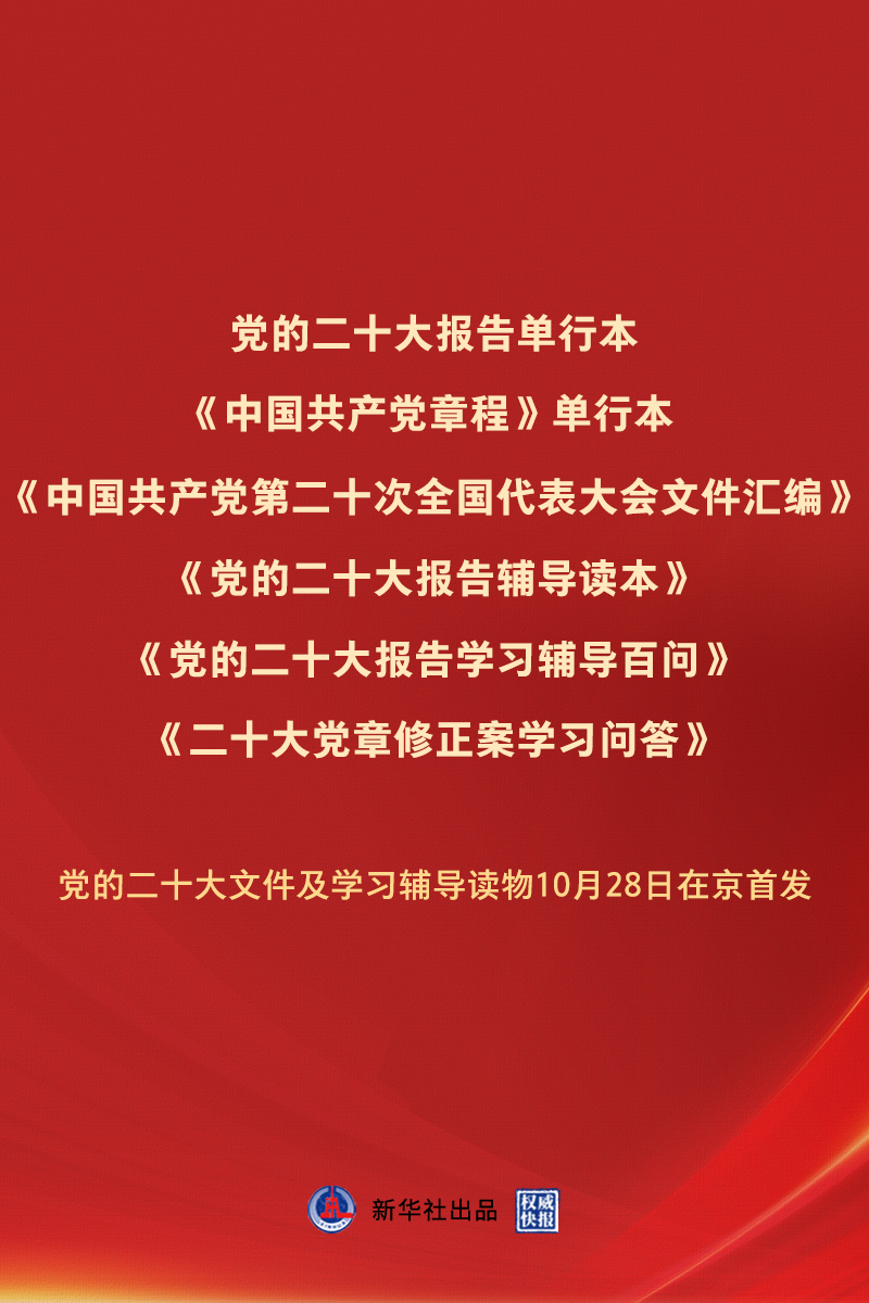 人民出版社出版了党的二十大报告单行本、《中国共产党章程》单行本、《中国共产党第二十次全国代表大会文件汇编》3种10个版本的大会文件单行本及汇编本。由大会文件起草组组织编写的3种权威辅导读物,即人民出版社出版的《党的二十大报告辅导读本》,党建读物出版社与学习出版社联合出版的《党的二十大报告学习辅导百问》,党建读物出版社出版的《二十大党章修正案学习问答》同步推出。