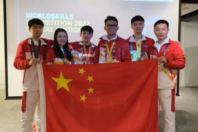 马宏达获得金牌后与获奖选手合影。人社部供图