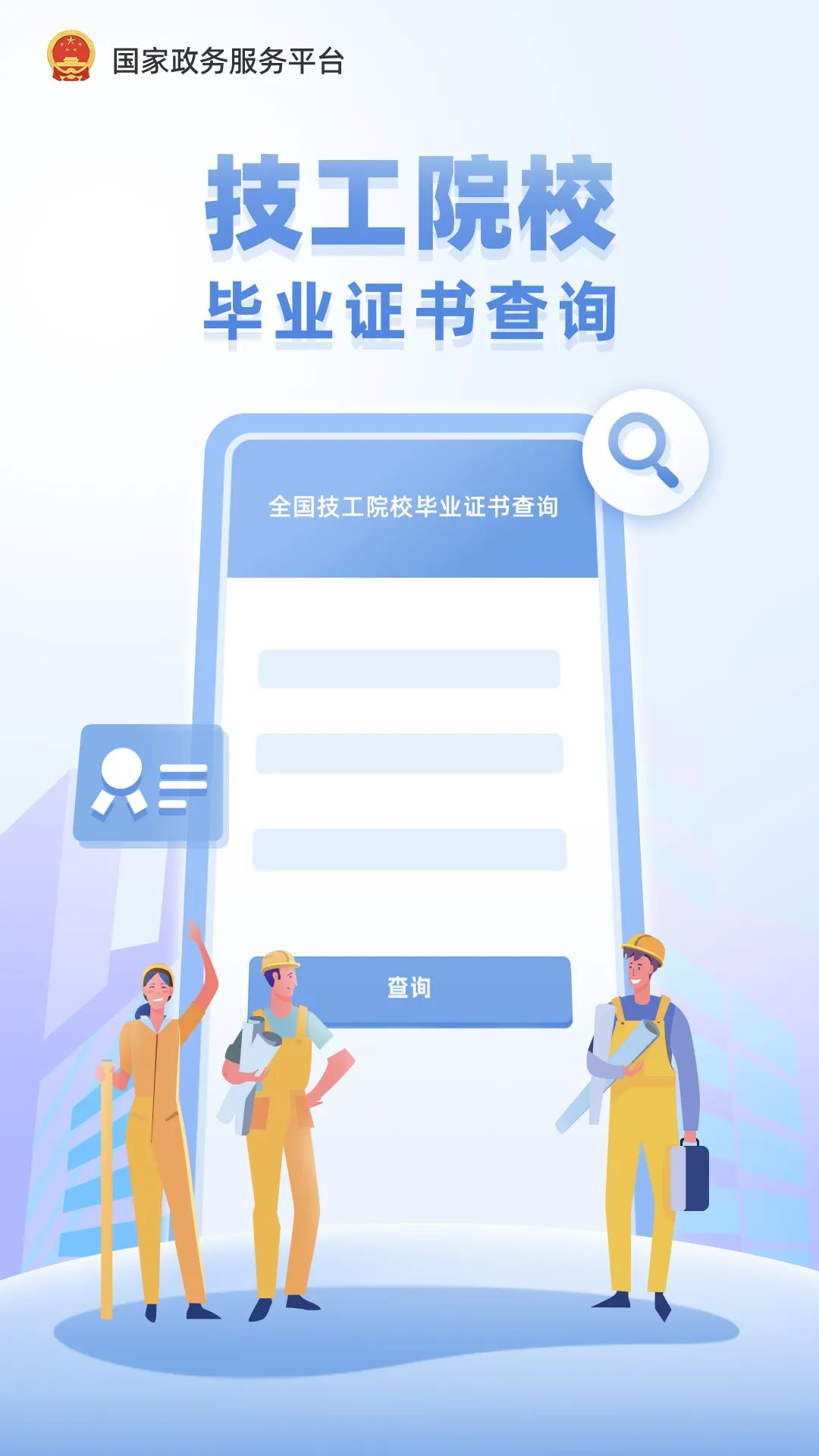 国家政务服务平台接入由人力资源和社会保障部提供的全国技工院校毕业证书查询服务,动动手指,一键查询,将毕业证书轻松“装”进手机。
