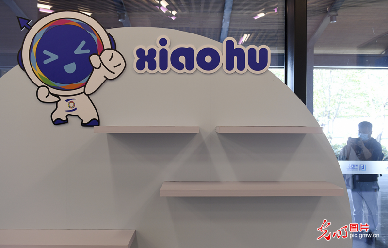 2022年11月6日,乌镇互联网国际会展中心一侧媒体中心外,媒体记者拍摄世界互联网大会乌镇峰会吉祥物小互。(光明网记者 潘迪摄/光明图片)