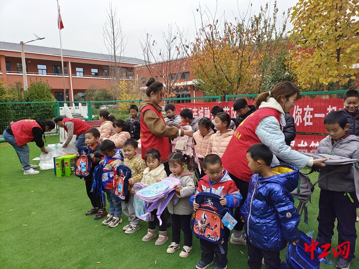 11月4日,志愿者为学生发放衣服和学习用品。济源市总工会供图