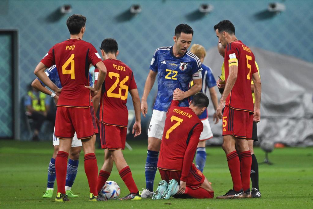 12月1日,日本队球员吉田麻也(前右三)在比赛中拉起西班牙队球员莫拉塔(前右二)。新华社记者 李尕 摄