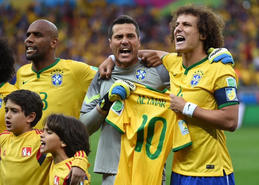 资料图:2014年7月8日,在巴西世界杯半决赛前,巴西队球员大·路易斯(右)和守门员朱·塞萨尔(中)共同手持缺席的内马尔的球衣唱国歌。当日,巴西队1:7不敌德国队。新华社记者 李尕 摄