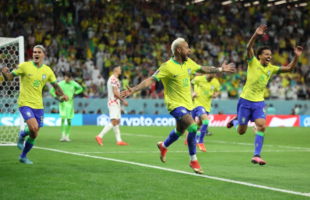 12月9日,内马尔(右三)在对阵克罗地亚队的比赛中进球后庆祝。新华社记者 李明 摄