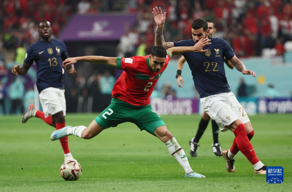 12月14日,摩洛哥队球员阿什拉夫(中)与法国队球员特奥(右)在比赛中拼抢。新华社记者 兰红光 摄