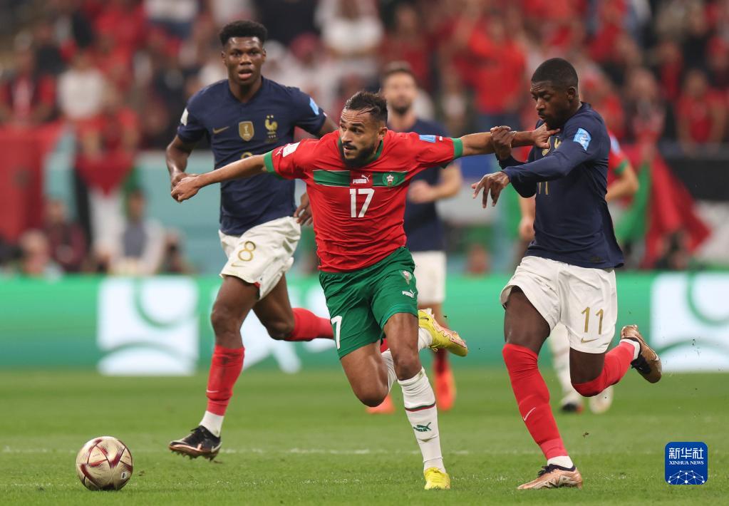 12月14日,摩洛哥队球员布法尔(中)与法国队球员登贝莱(右)在比赛中拼抢。新华社记者 曹灿 摄