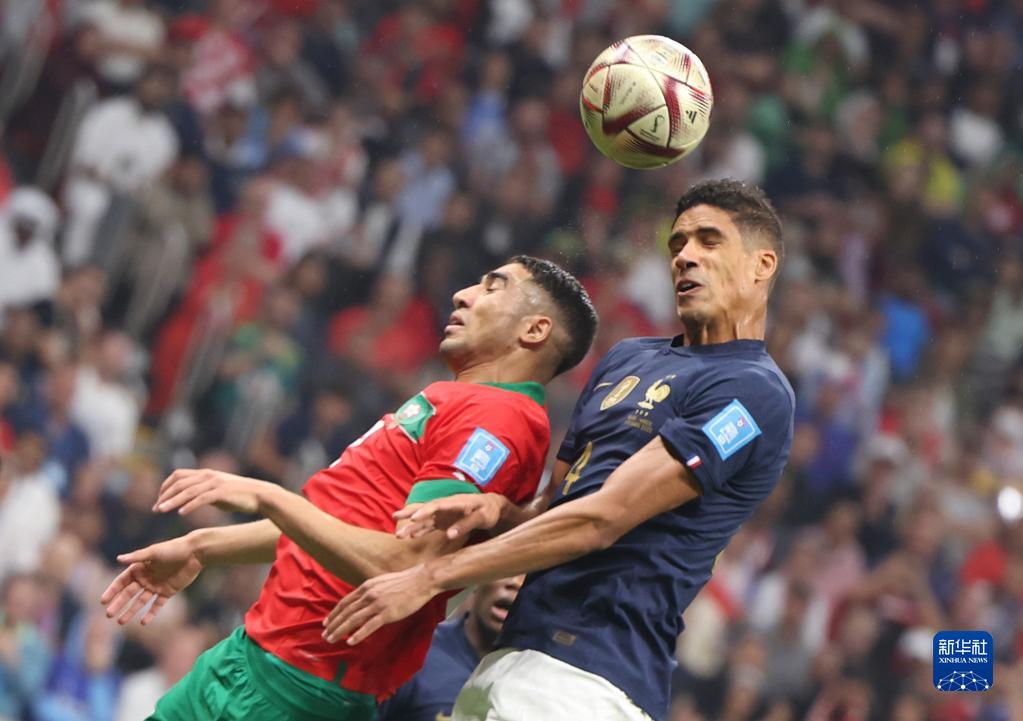 12月14日,法国队球员瓦拉内(右)与摩洛哥队球员阿什拉夫在比赛中争顶。新华社记者 曹灿 摄