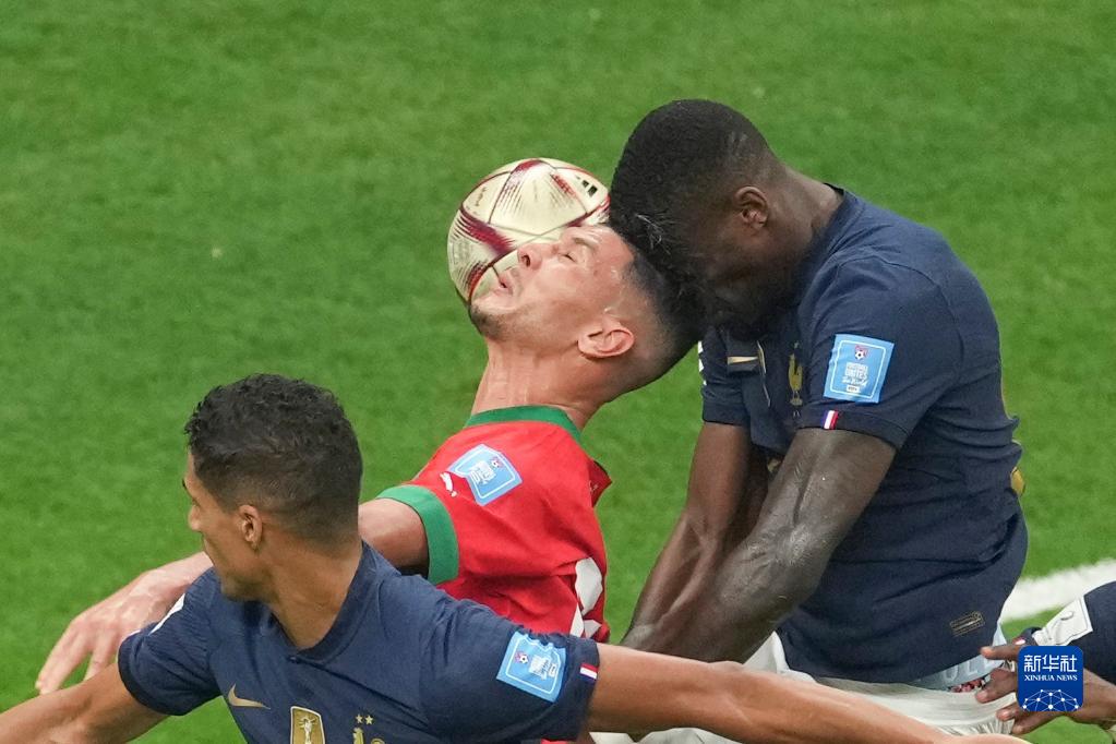12月14日,法国队球员马库斯·图拉姆(右)与摩洛哥队球员达里(中)在比赛中争顶。新华社记者 肖艺九 摄