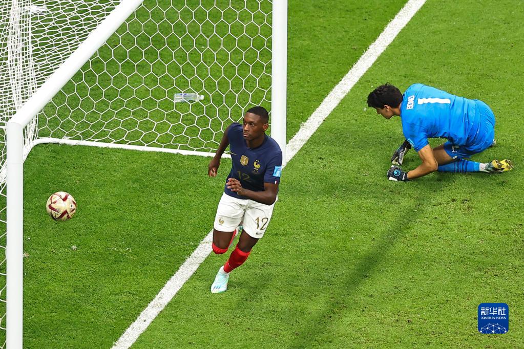 12月14日,法国队球员特奥(前右)在比赛中射门得分。新华社记者 潘昱龙 摄