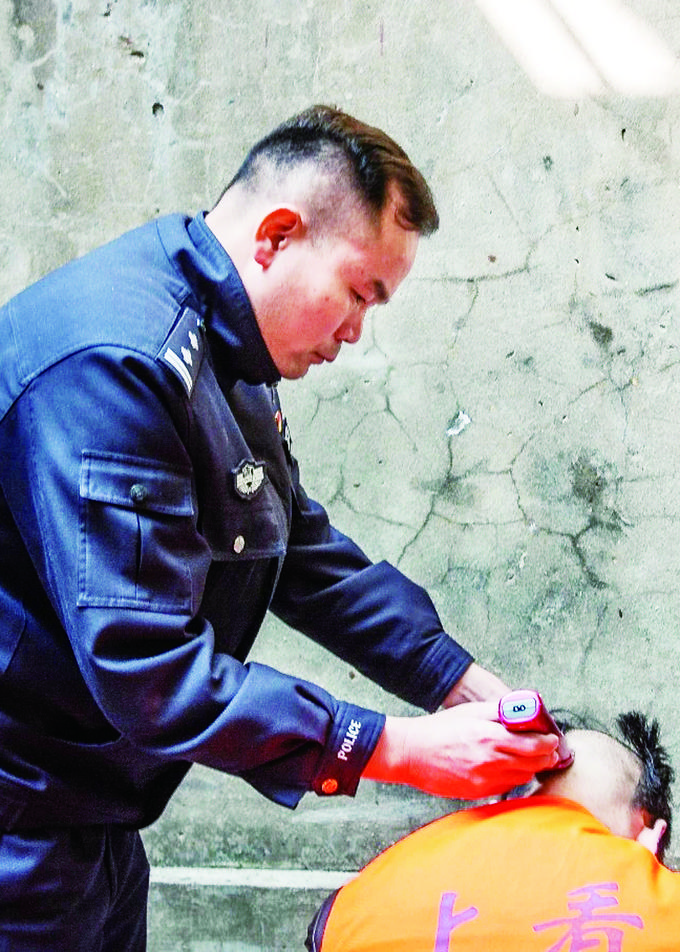 罗万甘给在押人员理发。