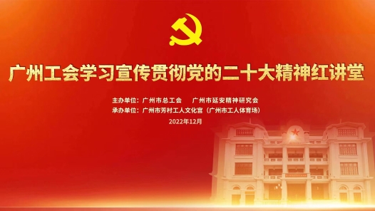 直播回顾丨广州工会学习宣传贯彻党的二十大精神红讲堂(下)(一) 12月23日,为深入学习宣传贯彻党的二十大精神,培养打造劳模宣讲和红色讲解员队伍,加强职工思想政治引领,引导广大职工坚定理想信念,把思想统一到党的二十大精神上来,广州市总工会决定举办“广州工会学习宣传贯彻党的二十大精神红讲堂”系列宣讲报告暨劳模宣讲、红色讲解员队伍培训。中工网首页、视频号等同步直播。