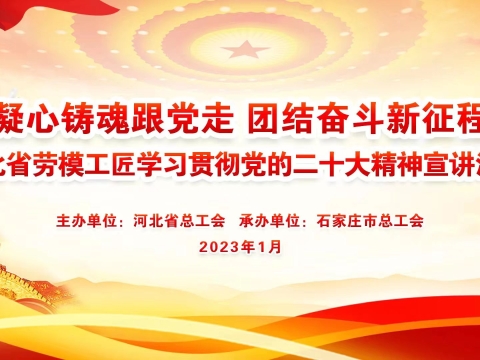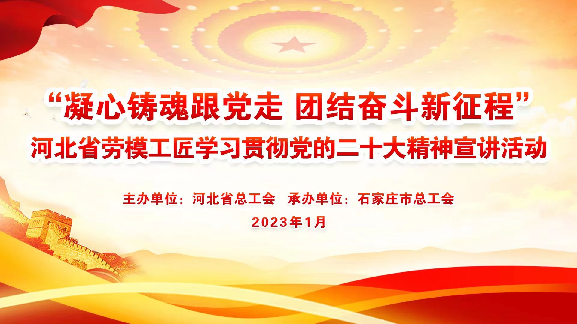 直播回顾丨河北省劳模工匠学习贯彻党的二十大精神宣讲活动(一) 1月12日上午9点30分,为进一步深入学习宣传贯彻党的二十大精神,由省总工会主办、石家庄市总工会承办的“凝心铸魂跟党走 团结奋斗新征程”河北省劳模工匠学习贯彻党的二十大精神宣讲活动在石家庄举办,中工网首页同步直播。
