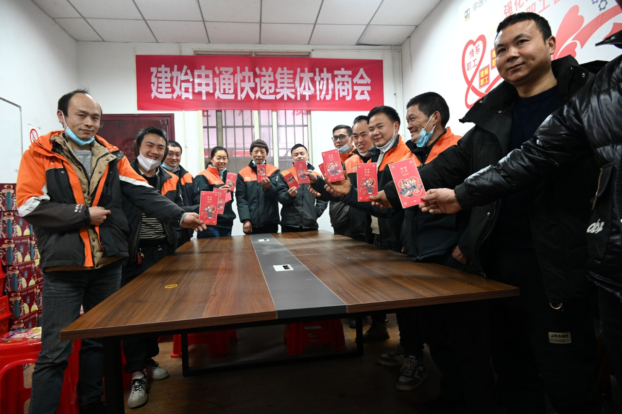 1月15日是南方小年,湖北省建始县申通快递公司的快递小哥围桌而坐,畅所欲言讲述集体协商职工增收入一个个鲜活故事。现场领工资,发福利、兑现年终奖(红包)快递小哥的“小年”特别暖心。