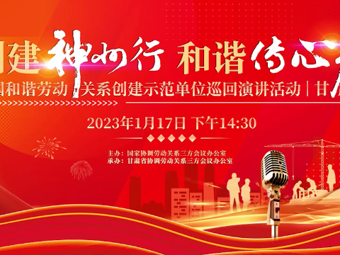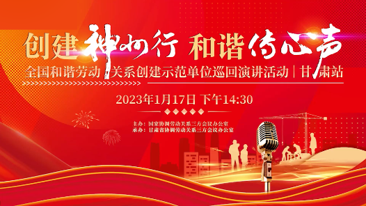 直播回顾丨创建神州行 和谐传心声——全国和谐劳动关系创建示范单位巡回演讲活动(甘肃站)(一) 创建神州行,和谐传心声!为进一步扩大和谐劳动关系创建活动影响力、传播力,展现甘肃省和谐劳动关系生动实践和昂扬向上的精神风貌,1月17日(星期一)下午2点,甘肃省协调劳动关系三方委员会组织开展2022年全国和谐劳动关系创建示范单位巡回演讲活动(甘肃站)。中工网首页同步直播!