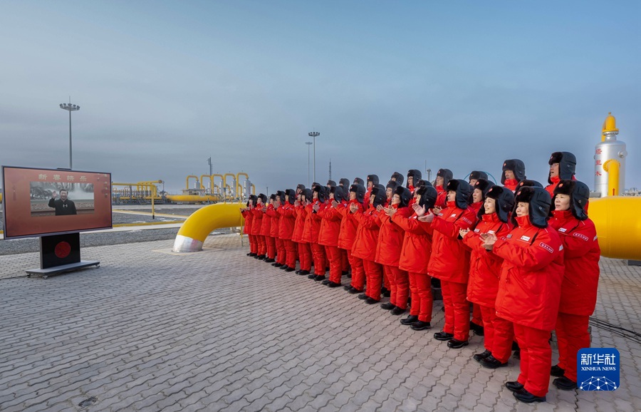 1月18日,中共中央总书记、国家主席、中央军委主席习近平在北京通过视频连线看望慰问基层干部群众,向全国各族人民致以新春的美好祝福。这是习近平通过视频连线,同塔里木油田公司轮南油气储运中心西气东输第一站克拉集气区员工亲切交流。新华社记者 李涛 摄