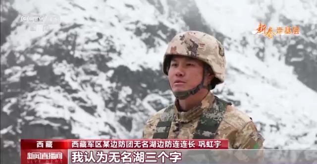 西藏军区某边防团无名湖边防连连长 巩虹宇:我认为无名湖三个字主要在于一个“湖”字,因为湖水是波澜不惊的,它没有像海水那样波涛汹涌,也没有像江河那样奔腾万里,这恰恰也反映了边防一线官兵默默无闻坚守在自己的岗位上,就像湖水那般。