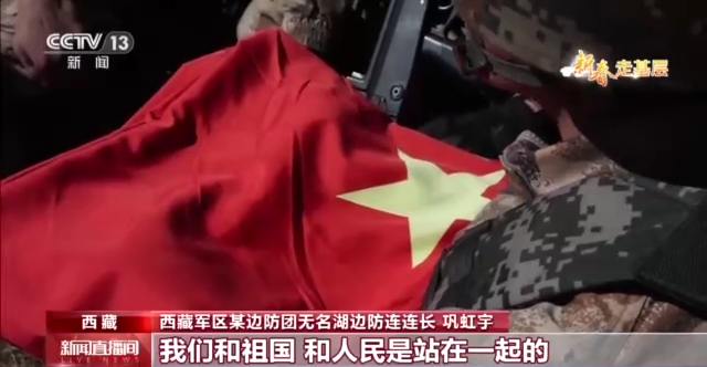 西藏军区某边防团无名湖边防连连长 巩虹宇:这面国旗是从首都北京带回咱们边防一线的,我想我们都应该深刻地感受到,我们和祖国、和人民是站在一起的,心是相连在一起的。