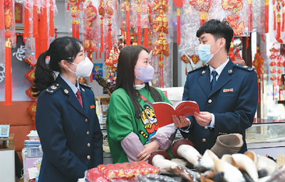 春节期间,国家税务总局福州市台江区税务局开展“暖企惠民春风行”活动,该局青年干部走进辖区年货批发市场,主动服务,为商家送政策、问需求、解难题,精准用税惠红利和真情服务,助力“年货市场”焕发勃勃生机。图为福建省福州市台江区税务人员为商家解难题。王旺旺摄(人民视觉)