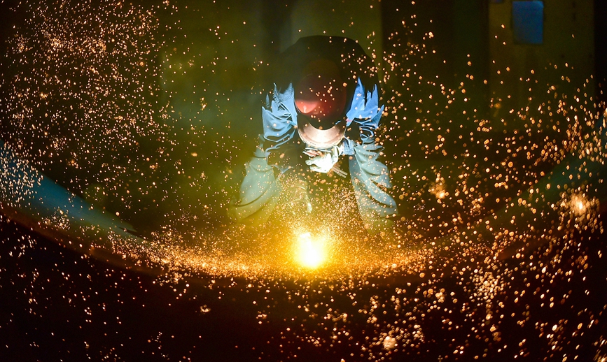 车间内,工人正在焊接一批出口的矿用磨机筒体订单。黄政伟 摄