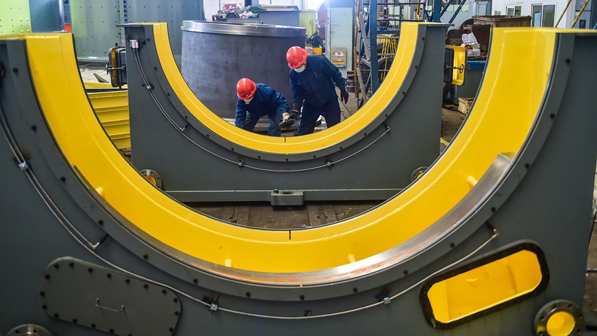 重工装配车间内,正在安装一批出口的矿用磨机齿轮罩订单。黄政伟 摄