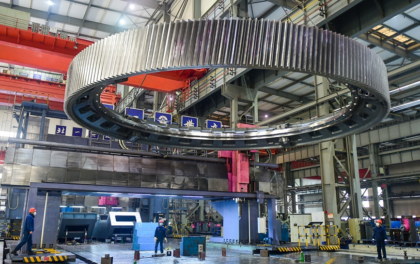 重数车间内,工人正在吊装加工一批出口的矿用磨机齿圈订单。黄政伟 摄