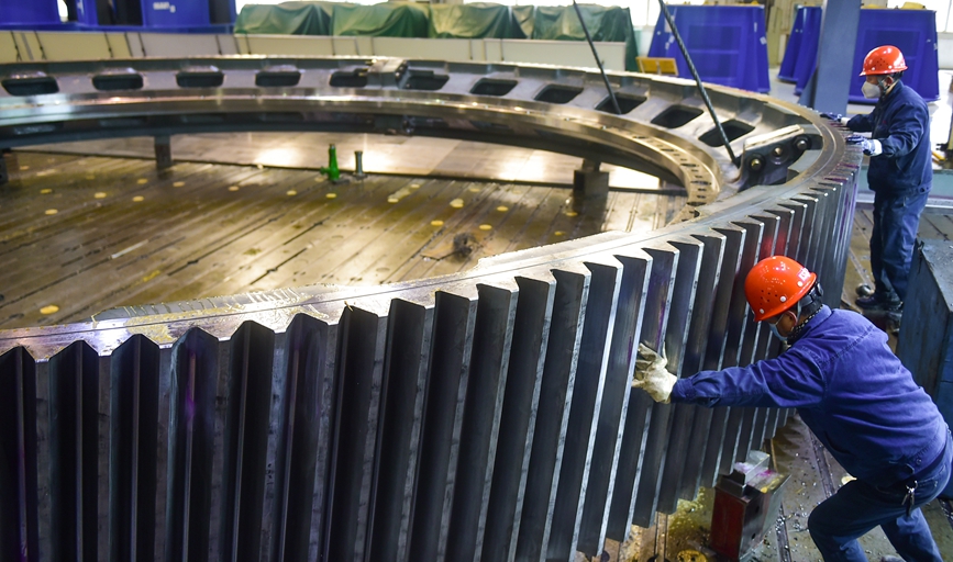 装配车间内,正在安装一批出口的矿用磨机齿轮罩订单。黄政伟 摄