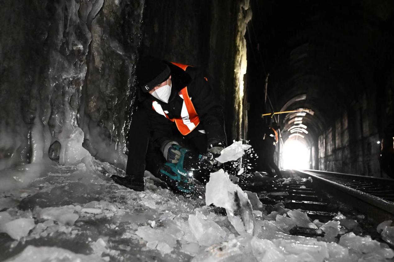 工友在清理隧道内的床积冰。(图片由太原局太原工务段赵哲昌提供)