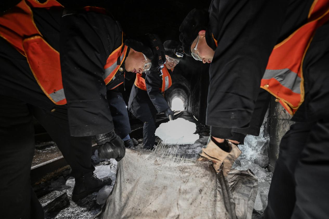 为防止击落的冰块二次结冰,队员们要将几十斤重的冰块搬运出隧道。(图片由太原局太原工务段赵哲昌提供)