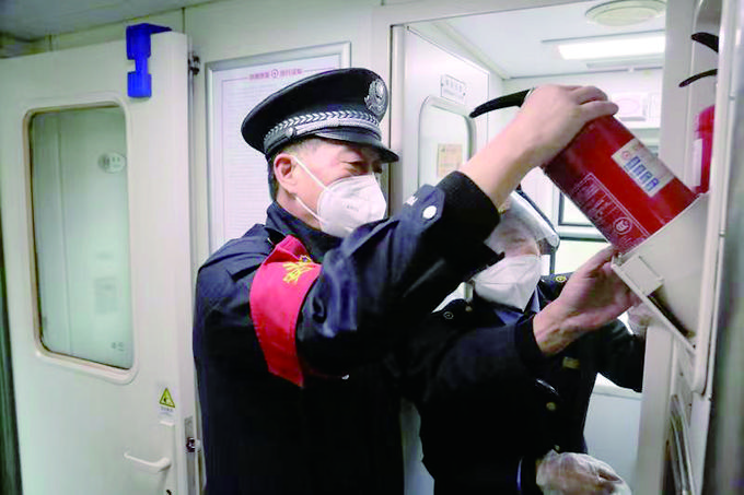 熊平章对列车消防设备进行安全检查。郝黎俊摄