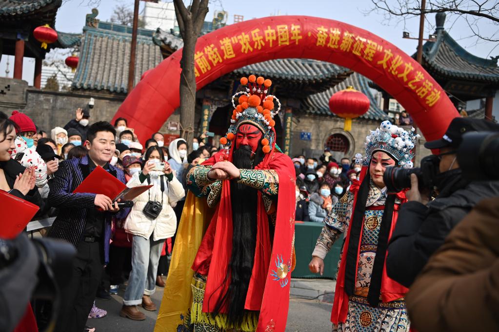 日前,山西太原市迎泽区庙前街道举办的民俗活动中,晋剧戏歌《千秋关圣》吸引了在场观众。