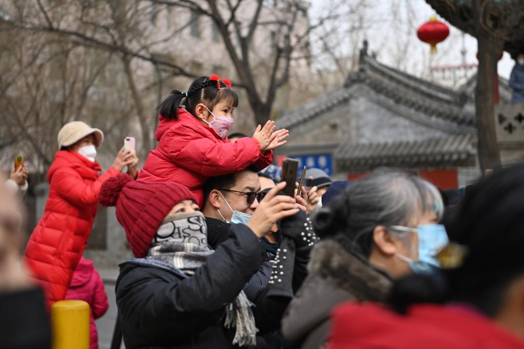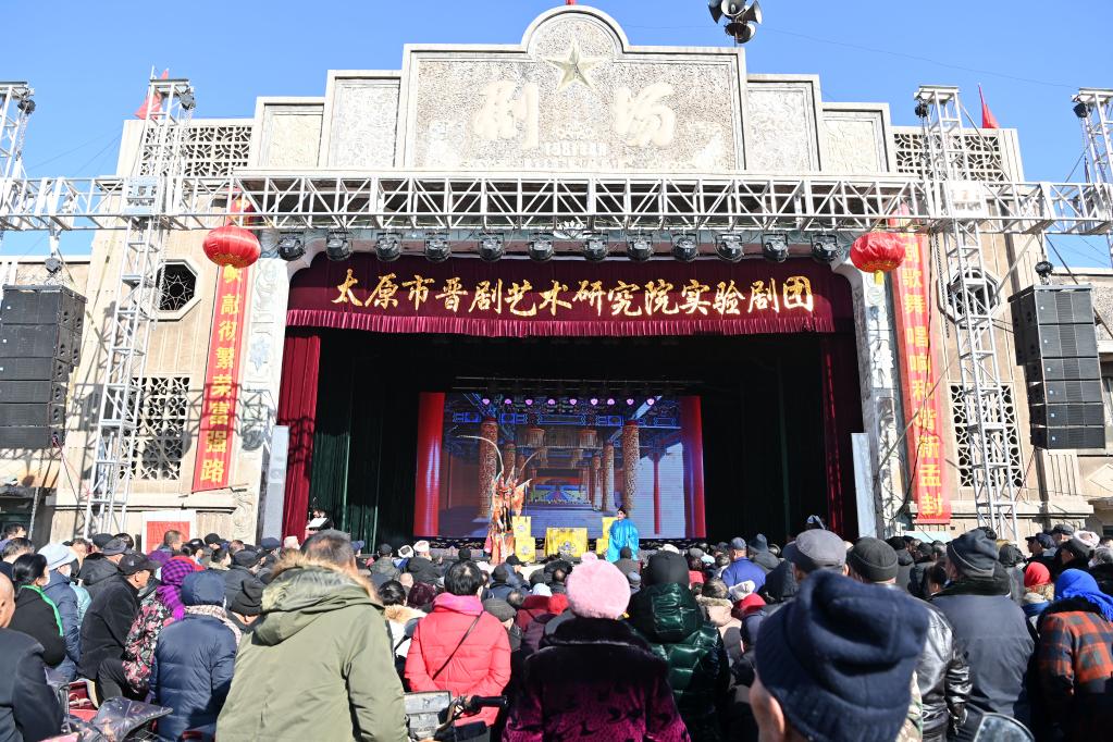 2月2日,在山西太原迎泽区庙前街道举办的民俗文化活动上,男女老少观看戏曲表演。