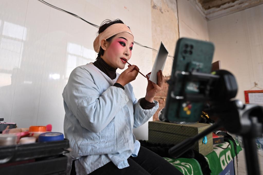 1月30日,在山西省太原市清徐县孟封村,太原市晋剧艺术研究院实验剧团演员在后台直播化妆。