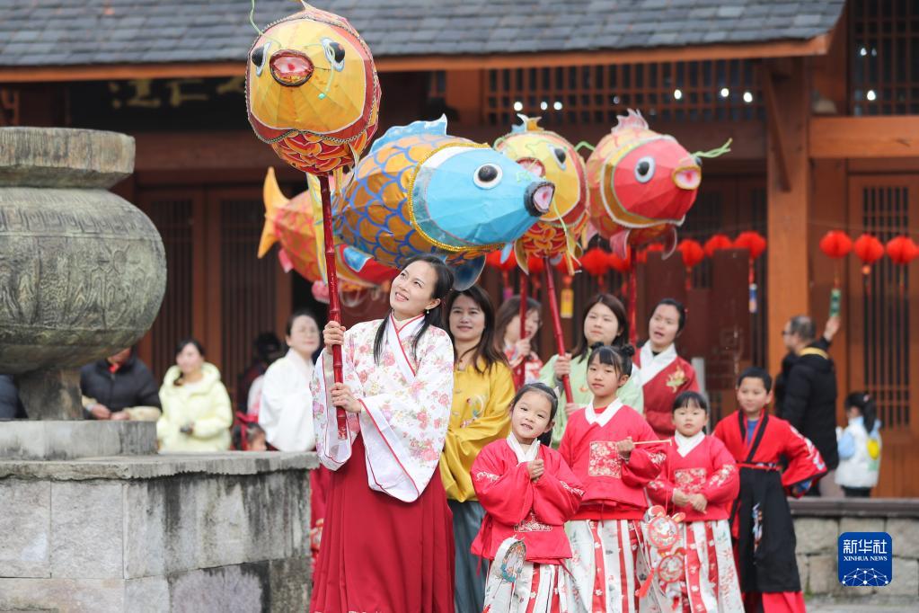 2月4日,在浙江省湖州市德清县下渚湖街道二都村,村民在舞鱼灯。