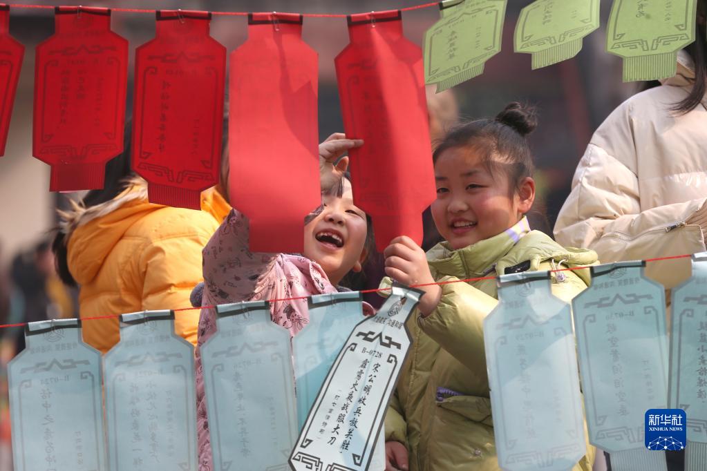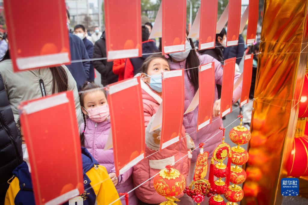 2月3日,在四川省眉山市东坡区三苏祠前的启贤广场,小朋友在猜谜语。