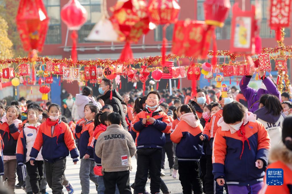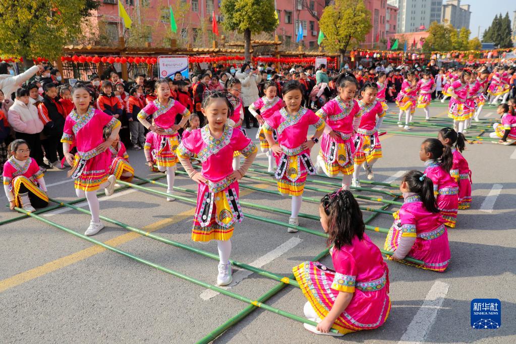 2月4日,安徽省淮北市濉溪路小学的学生们在跳竹竿舞。