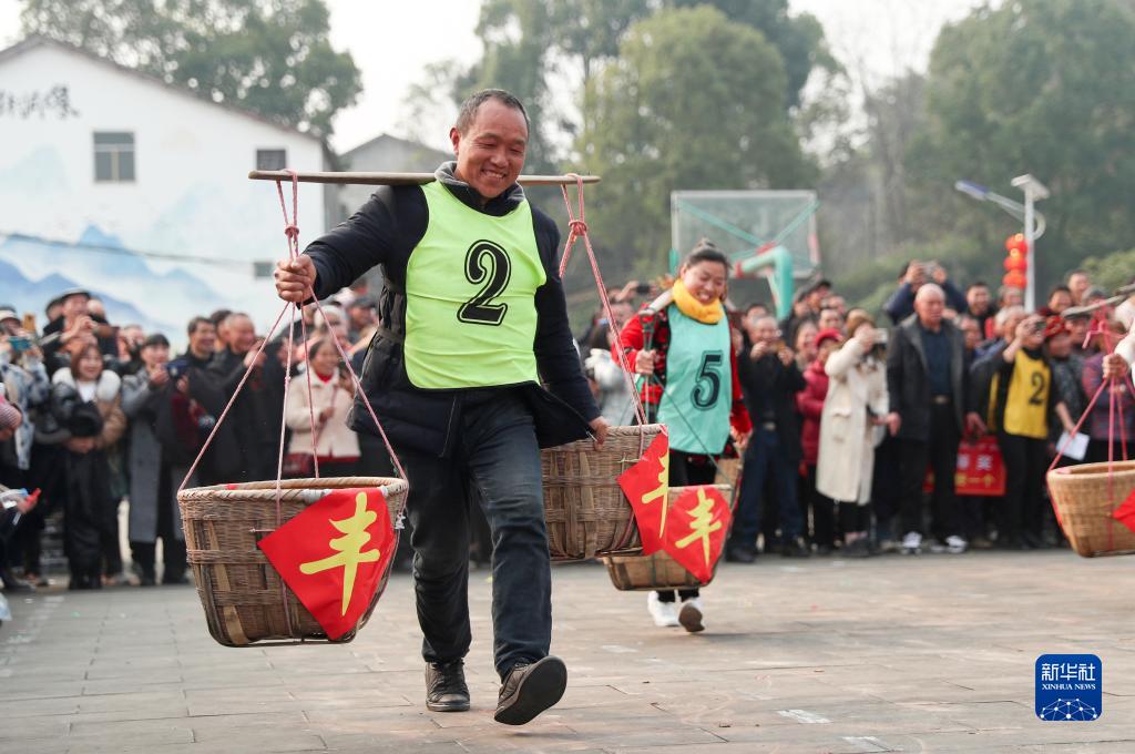 2月3日,四川省华蓥市华龙街道办事处的居民在东方村参加趣味活动“接力运粮”。