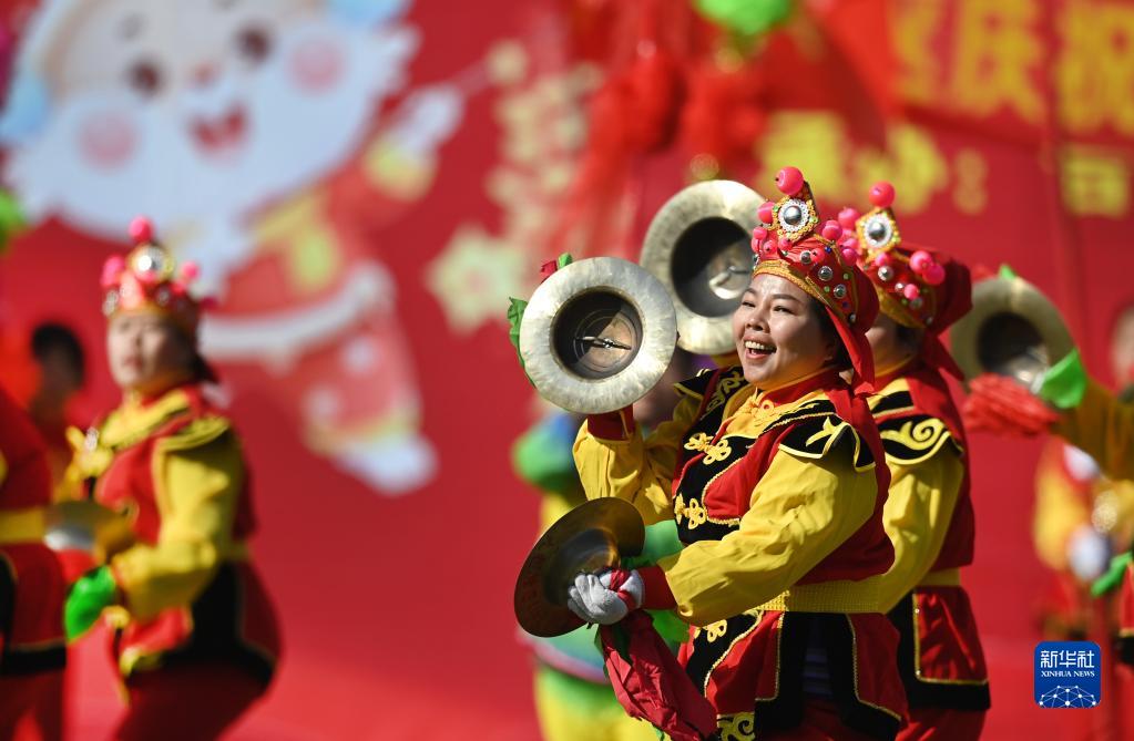 2月4日,陕西省渭南市合阳县体育场内,居民进行锣鼓展演。