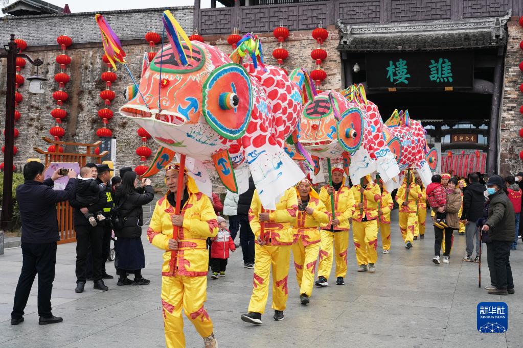 2月4日,民间艺人在安徽歙县古城表演瞻淇鱼灯。