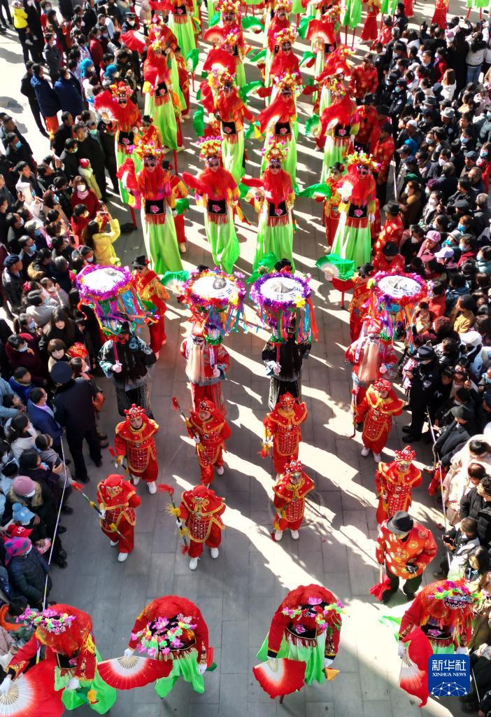2月3日,甘肃省和政县举行秧歌汇演活动。这是乡村秧歌队在和政县街头表演(无人机照片)。