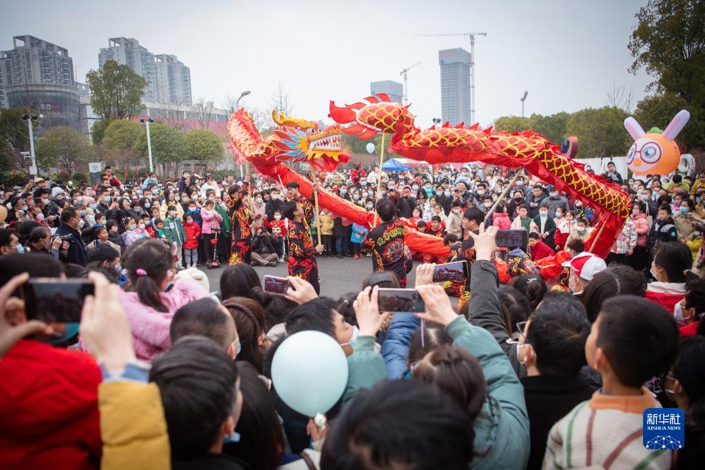 2月4日,市民在湖北省武汉市武汉体育中心举行的中国车谷新春游园灯会上观看舞龙表演。