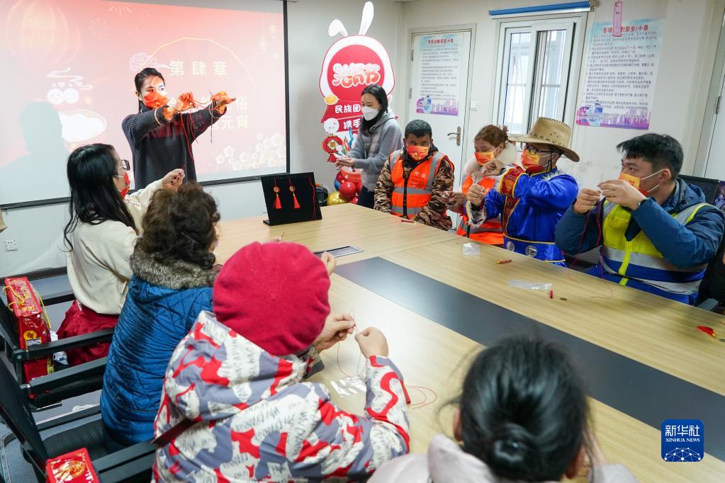 2月4日,在中建三局浙江公司南京华贸中心项目部,工人和南京市鼓楼区工人新村社区居民学习制作中国结。
